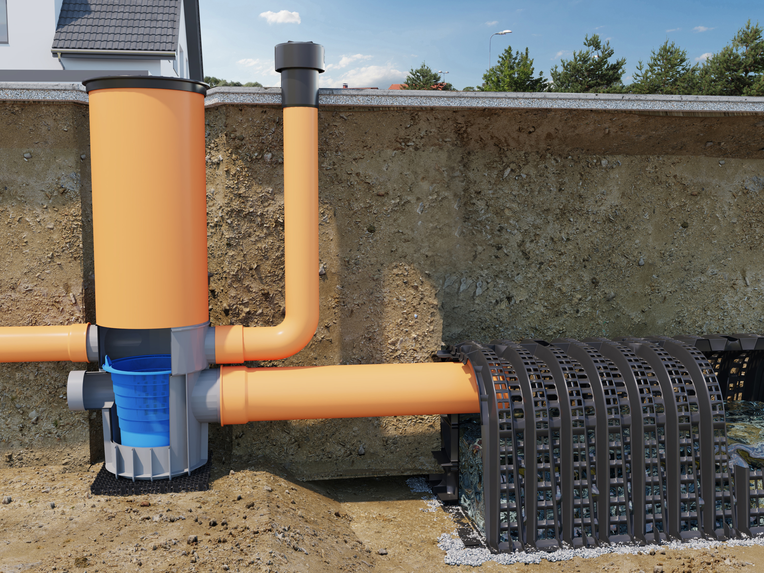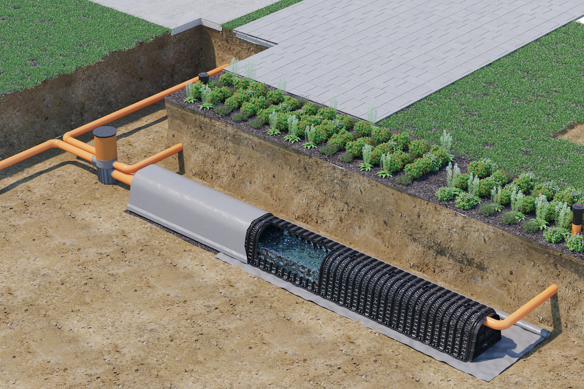 Zur Tunnelrigole gehören im Systembausatz ein Filterschacht, zwei Endwände, Geotextil als wasserdurchlässiges Trennvlies zur allseitigen Ummantelung der Tunnel und ein Entlüfter. Der Einbau ist dank der Tragegriffe und der unkomplizierten Verbindung sehr einfach. Zur Schaffung des gewünschten Speichervolumen können mehrere Tunnelelemente aneinander gereiht werden. Die Verlegung erfolgt auf einem verdichteten und abgezogenen Sandplanum.